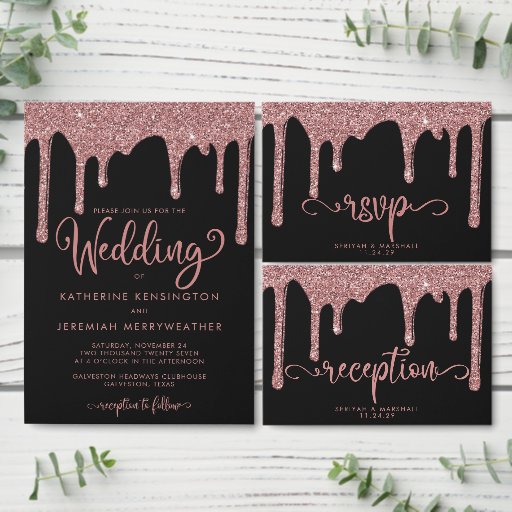 Chic Black Rose Gold Dripping Glitter Wedding Place Card