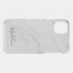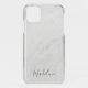 This simply chic case features a white printed marble background with subtle light gray hues and modern black script monogram that can be personalized with your first name. This design will show up best on white colored phones.