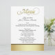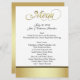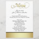 Elegant wedding reception table menus done in white, with a band of gold and black, on the bottom front and gold tone covering the back of the menu. Menu in gold tone fancy graphic script text, decorates the top of the menu. All the rest of the black text is ready to personalize for your wedding reception. Matching wedding products available.