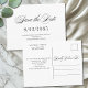 This simple, elegant black and white wedding save the date postcard features a minimalist layout that combines fun, whimsical, classy script typography and classic serif fonts in black on a plain pure white background for a modern yet timeless design with vintage flair. The Save the Date title text is written on the front in a romantic handwriting calligraphy font with whimsical flourishes, with a customizable date and details below in popular serif typography. The back includes customizable names, return address, and message text. You can edit the text in the product template to personalize this item for your own wedding.