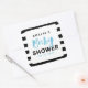 This stylish baby shower square sticker features a chic black and white stripes background and the word "Baby" in blue watercolor; it's perfect for a boy baby shower. Use it to seal your envelopes, favor bags or for decoration.