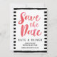 This modern and chic Save the Date card features a stylish black and white stripes background and the word "Save the Date" in red watercolor. This card also includes a patterned back side.