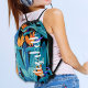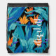 A stylish drawstring bag features a pattern of tropical bird of paradise flowers in turquoise, blue and orange and is personalized with your name in chic lettering. Create for yourself or give as a gift. MATCHING items in our travel collection.