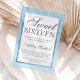 A modern, pretty chic and elegant faux blue glitter shower ombre with pastel blue color block Sweet 16 birthday party invitation with blue ombre pattern fading onto a light blue background , affordable low budget party .