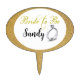 This gold glittery bride-to-be cake topper features a silver engagement ring plus the bride's name. Personalize this cake pick with the Bride's name