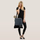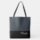 This lovely fashion forward tote bag shows the word "Bride" in white text color over black with the upper tote bag in custom Steel. Has plenty of room for personalized text. Graphics and text are on both sides of this tote bag. Black handle. Customize further or buy as shown.