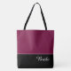 This lovely fashion forward tote bag shows the word "Bride" in white text color over black with the upper tote bag in custom Cassis. Has plenty of room for personalized text. Graphics and text are on both sides of this tote bag. Black handle. Customize further or buy as shown.