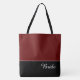 This lovely fashion forward tote bag shows the word "Bride" in white text color over black with the upper tote bag in custom Merlot. Has plenty of room for personalized text. Graphics and text are on both sides of this tote bag. Black handle. Customize further or buy as shown.