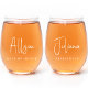 Elevate your bridal party's toasts with our unique set of 2 personalized stemless wine glass keepsake gifts for your bridesmaids and maid of honor to enjoy at your engagement party, bridal shower, bachelorette party, rehearsal dinner and wedding reception. These chic wine glasses will add a touch of elegance to each event and can be personalized with the name of your maid of honor, bridesmaids, mother, sisters, and more, in a stylish white calligraphy script and their role in elegant white serif typography.