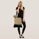 This lovely fashion forward tote bag shows the word "Bridesmaid" in white text color over black with the upper tote bag in custom Matte Gold. Has plenty of room for personalized text. Graphics and text are on both sides of this tote bag. Black handle. Customize further or buy as shown.