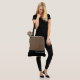 This lovely fashion forward tote bag shows the word "Bridesmaid" in white text color over black with the upper tote bag in custom Latte Brown. Has plenty of room for personalized text. Graphics and text are on both sides of this tote bag. Black handle. Customize further or buy as shown.