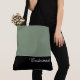 This lovely fashion forward tote bag shows the word "Bridesmaid" in white text color over black with the upper tote bag in custom Willow Green. Has plenty of room for personalized text. Graphics and text are on both sides of this tote bag. Black handle. Customize further or buy as shown.