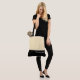 This lovely fashion forward tote bag shows the word "Bridesmaid" in white text color over black with the upper tote bag in custom Champagne. Has plenty of room for personalized text. Graphics and text are on both sides of this tote bag. Black handle. Customize further or buy as shown.