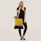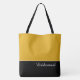 This lovely fashion forward tote bag shows the word "Bridesmaid" in white text color over black with the upper tote bag in custom Mellow Yellow. Has plenty of room for personalized text. Graphics and text are on both sides of this tote bag. Black handle. Customize further or buy as shown.