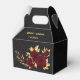 Chic and elegant wedding favor box featuring beautiful burgundy flowers and some elegant gold leaves.