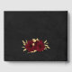 Chic and elegant wedding guest book featuring beautiful burgundy flowers and some elegant gold leaves .
