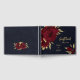 Chic and elegant navy wedding guest book featuring beautiful burgundy flowers and some elegant gold leaves .