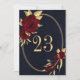 Chic and elegant navy blue table number card featuring beautiful burgundy flowers and some elegant gold leaves on gold geometric frame.