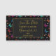 Eye-catching save the date wedding reminder in black and gold. Designed with an elegant pattern with a graphic illustration of fluttering butterflies in many bright colors, contrasting very nicely on the black background. Whimsical florals, sprigs and leaves add a bit of charm. A black frame with a gold colored border layered over top with your personalized text inside. Customize with the bride and grooms name and their wedding location and date.