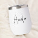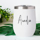 Chic personalized thermal wine tumbler showcasing your name monogrammed in a stylish calligraphy script. Elevate your glassware or surprise your mom, sister, friends, bridesmaids, bridal shower and bachelorette party guests, and other loved ones with a thoughtful and elegant gift. If needed, edit in the design tool to increase or decrease the script size for longer or shorter names.
