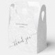 Elegant white on white filigree print pattern with your names and thank you in chic charcoal gray (or any color) lettering on the front, these gable style party favor boxes are beautiful for wedding favors, bridal shower favors or any special occasion.