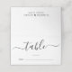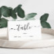 Chic wedding table number place card with "table" in an elegant calligraphy script with swashes and blank lines for you to fill in the table number and the name of your guest. On the back, add your first names joined by a heart and your reception date.