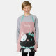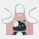 Cat apron in pink with a big illustration of a cute black and white cat wearing a pretty bow and a pearl necklace. Personalize with name!