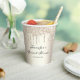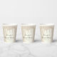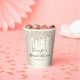 These personalized glitter and glam paper cups will add sparkle to your bridal shower. This chic design template features a top border of champagne dripping glitter on a shiny ivory background. Customize with a name and date in modern black script.. Designed by artist Susan Coffey.
