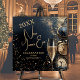 Stylish New Year's Eve party square foam board welcome sign features a champagne glass, clocks, confetti and fireworks on a midnight blue background with your party details in chic lettering. The BACK has "Happy New Year", the year and "Thanks for Celebrating with us". MATCHING items in our collection.