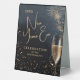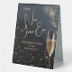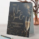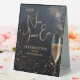 Stylish New Year's Eve party table welcome tent sign - choose PLASTIC or PAPER - features a champagne glass, clocks, confetti and fireworks on a midnight blue background with your party details in chic lettering. MATCHING items in our collection.