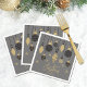 Black and gold Christmas tree ornaments and snowflakes on a grey background highlight these holiday party napkins with your name and Merry Christmas in chic lettering. Perfect for your personal or business holiday parties.