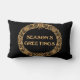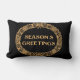 A festive Lumbar Pillow or Cushion with a Christmas wreath of holly, ivy, poinsettias, fir cones and sprigs of fir tree, This hand-drawn Christmas wreath is in gold-effect on a black background, with 'Season's Greetings' in decorative lettering, also in gold-effect.