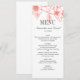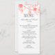 Elegant and romantic style magnolia wedding dinner menu card design in coral and pewter gray color scheme.