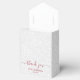 Elegant white on white filigree print pattern with your names and thank you in chic cranberry red (or any color) lettering on the front, these ribbon closure tent style party favor boxes are beautiful for wedding favors, bridal shower favors or any special occasion.