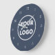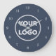 Replace the sample company logo with your own in the sidebar to create a chic wall clock for your business with a navy blue background. White or light colored logos will work best on the dark background. If you want the background color to show through your logo, upload a version of your logo with a transparent background. Classic white numbers around the edge make it easy to tell the time. Click to customize further if you need to adjust the size of your logo with the scale buttons.