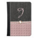 Stylish feminine Kindle Fire HD/HDX Folio Case done in graphics of a black on black damask pattern, on the top half of the case, and a muted pink stamped metallic look, on the bottom. Lovely graphics of a pink pearl strand runs across the middle of the case. Personalize the one pale pink letter monogram, to suit your needs.