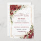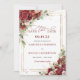 Popular now design for boho Save the date card features deep red marsala flowers roses mixed fresh eucalyptus greeneey foliage and woven into faux gold frame . Hand drawing script leterring.