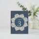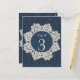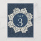 Pretty country chic wedding reception table number card, done in a blue on blue denim damask pattern. Graphics of an elegant antique like ivory doily, in the middle, has a blue round disc text area. Customize the number for each table at your reception and the text, on the back of the card. Matching wedding escort cards, invitations and other products available.