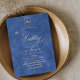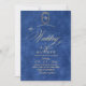 Elegant stylish blue and gold modern wedding invitation with an elegant handwritten font with curls and a monogram of the bride and groom. Classy and elegant, simple and modern invitation.