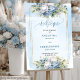 Designed for elegant, boho, or classic celebrations, this dusty blue floral welcome sign sets the tone for your big day the moment guests arrive. Its pastel blue and gold palette pairs beautifully with luxury, rustic, or coastal wedding décor.