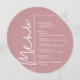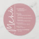 A round dusty rose dinner menu card features your menu choices in chic white lettering, perfect for a modern wedding reception, wedding rehearsal dinner, anniversary party or any special event with a sit-down dinner. Easily personalize with your dinner choices and details. MORE colors in our store.