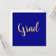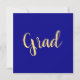 This elegant design features large centered "Grad" text written in festive, elegant warm yellow script. The background is deep, rich royal blue. The text can be personalized.