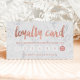 A modern, stylish loyalty card for hair and makeup artist business card with modern hand lettering style brush typography in faux rose gold foil on a trendy and elegant white marble background.
