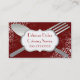 Stylish deep red business card, with graphics of a large silver tone fork and spoon, and elegant white flourishes, in the corners. A decorative white and silver tone text plaque, over the silverware, has custom red text. The back of the card is done in a dark red, with custom white text ready to personalize. Stylish stand out card that leaves a great lasting impression for your catering or any food service business.