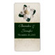 Elegant wedding mini wine labels ready for you to personalize with your own information. Chic ivory colored damask pattern, on the top and bottom of the label, with a dark green text area, in the center, edged on either side with a gold tone accent, and a lovely white gardenia flower, at the top of the label. Text, in ivory, is fully customizable to suit your wedding needs. Great for your wedding reception table or gift wines.