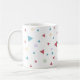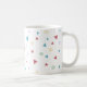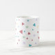 A modern and chic classic mug with geometric shapes of triangles and swirls in pastel green, yellow and red colour.