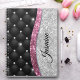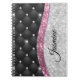 Make back to school fun with this Cute personalized Notebook. It is designed with elegant girly faux silver and pink glitter and rhinestones bling with tuffted black.