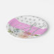 Chic and girly monogram paper plate with spring floral pink and peach flowers and a white background with gray polka dots. Your custom name and monogram are written in an elegant hand lettered white and gray script with a pink background. You can change the text color and font style and size using the customize option.