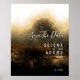save your wedding date and share your fabulous date with that artistic and elegant poster with golden misty watercolor landscape abstract painting with side bride and groom names, save the date typography and details in front and plain black in back.