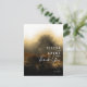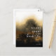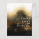 artistic and elegant wedding thank you card with golden misty watercolor landscape abstract painting with side bride and groom names, thank you typography and details in front and plain black in back.